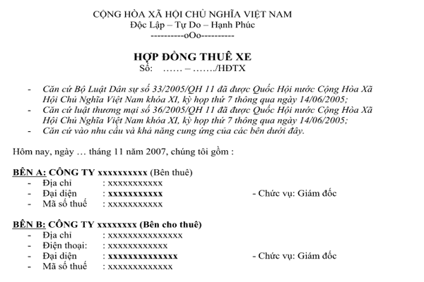 Mẫu Hợp Đồng Thuê Xe Ô Tô Có Tài Theo Tháng