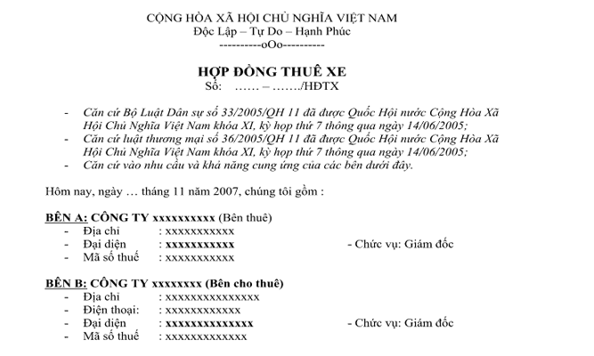 HỢP ĐỒNG THUÊ XE Ô TÔ CÓ TÀI THEO THÁNG